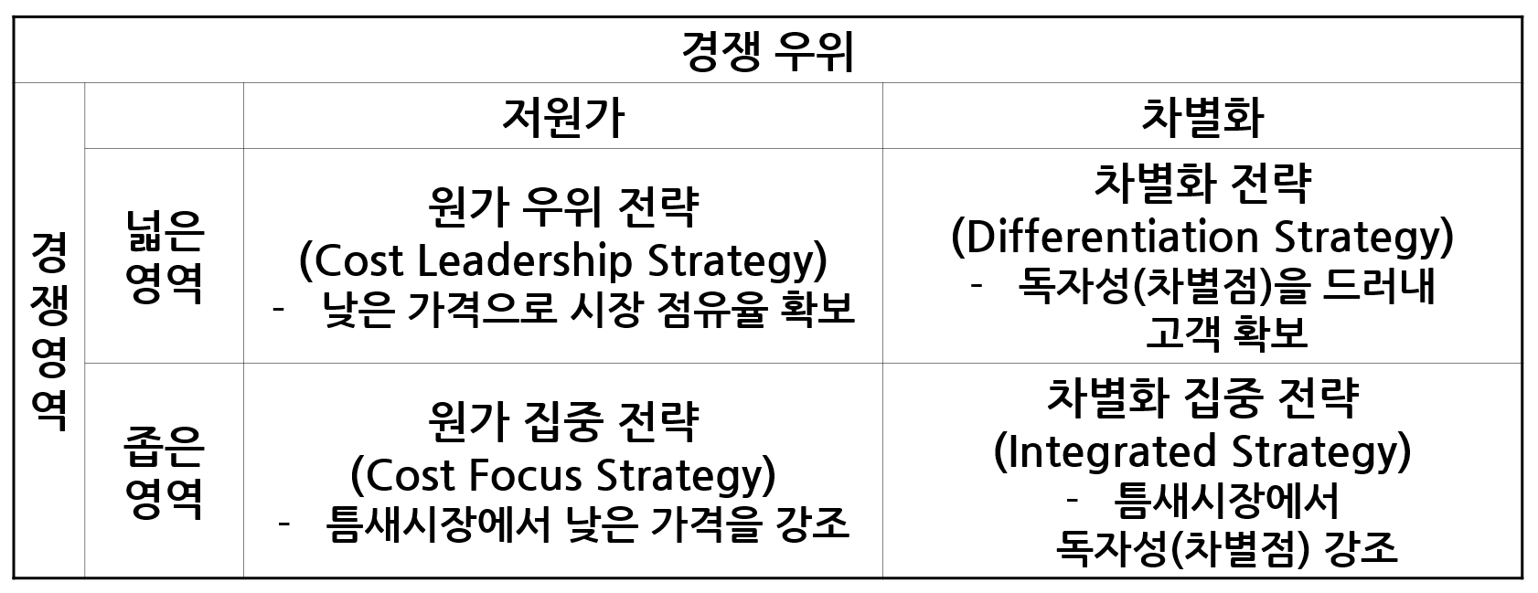 마이클 포터는 시장에서 경쟁력 있는 기업을 분석하기 위해 "시장 전략"이라는 개념을 제시하였으며, 다음과 같이 네 가지 유형으로 분류하였다.