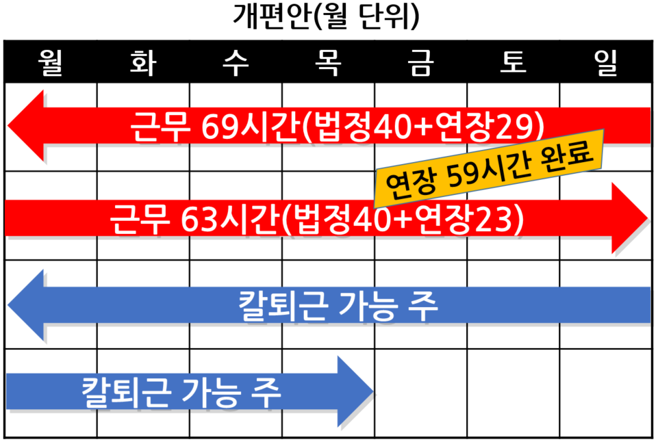 예를 들어, 한 달을 기준으로 첫 번째 주에 최대 근무 69시간(법정 40 + 연장 29)을 하고, 두 번째 주에 63시간(법정40+연장23)을 일한다면, 한 달 동안 가능한 연장근무 52시간을 채웠기 때문에 나머지 셋째, 넷째 주에는 칼퇴근이 가능하다는 거죠.