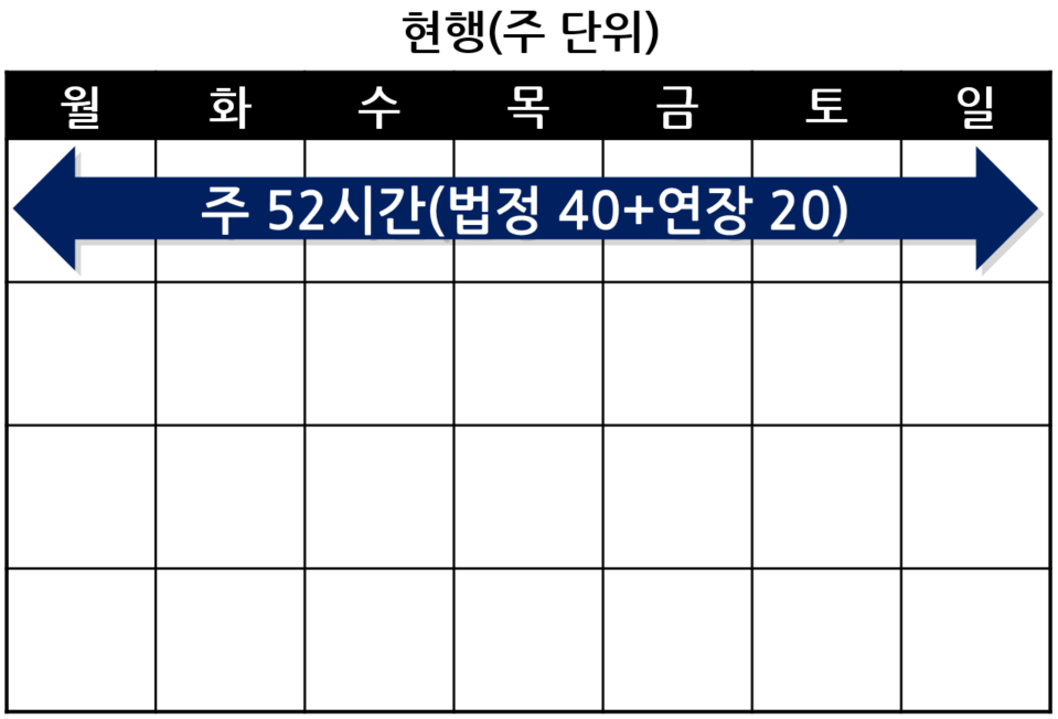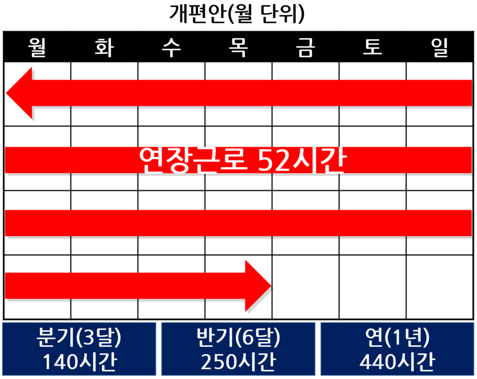 한 달 동안에는 연장근로 52시간이 가능하도록 하고, 분기, 반기, 연 단위로 최대 연장근로가 가능하도록 하겠다는 의미예요.